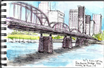 Sunday, the 30th of June ~ Portland, Oregon. I rushed through a sketch of the Hawthorne Bridge. It was ninety plus degrees in the sun... I was melting. This had to be good enough for the moment! Ink and watercolor in my little 5.50" X 8" sketch pad. Cheers from Portland!